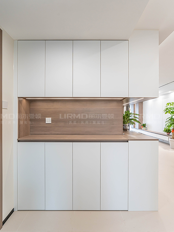 鞋柜和餐邊柜做了轉(zhuǎn)角銜接在直接連著沙發(fā)背景墻,電視柜和隱形門結(jié)合,整個(gè)空間簡(jiǎn)約而不失時(shí)尚
