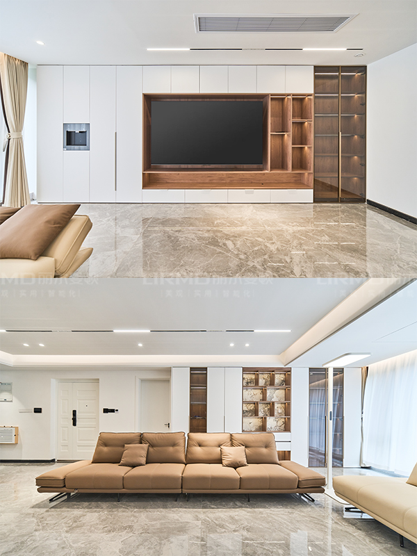 沙發(fā)背景和電視背景互相呼應(yīng),做同色設(shè)計,格柵+巖板進行局部點綴,增添亮點