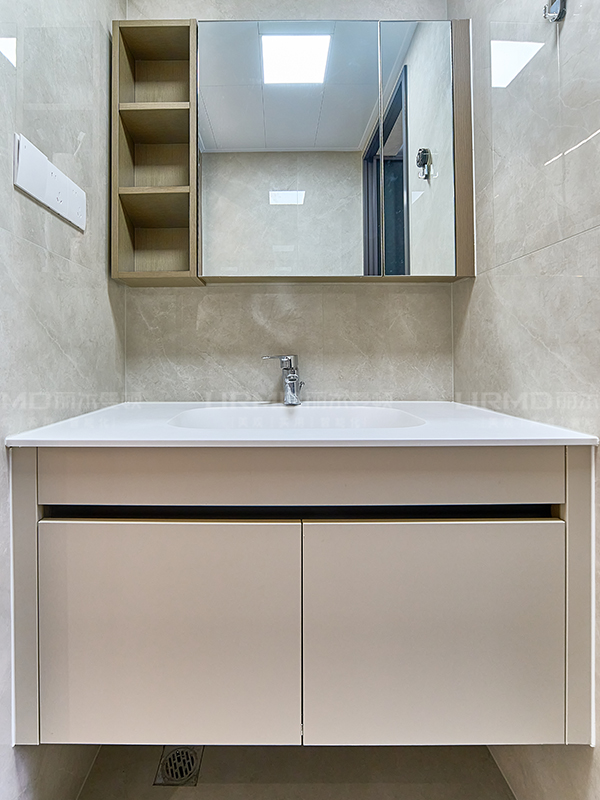 采用森嶼黑橡+金剛黑的顏色搭配,搭配亮面淺灰瓷磚,整體顏色和諧統一