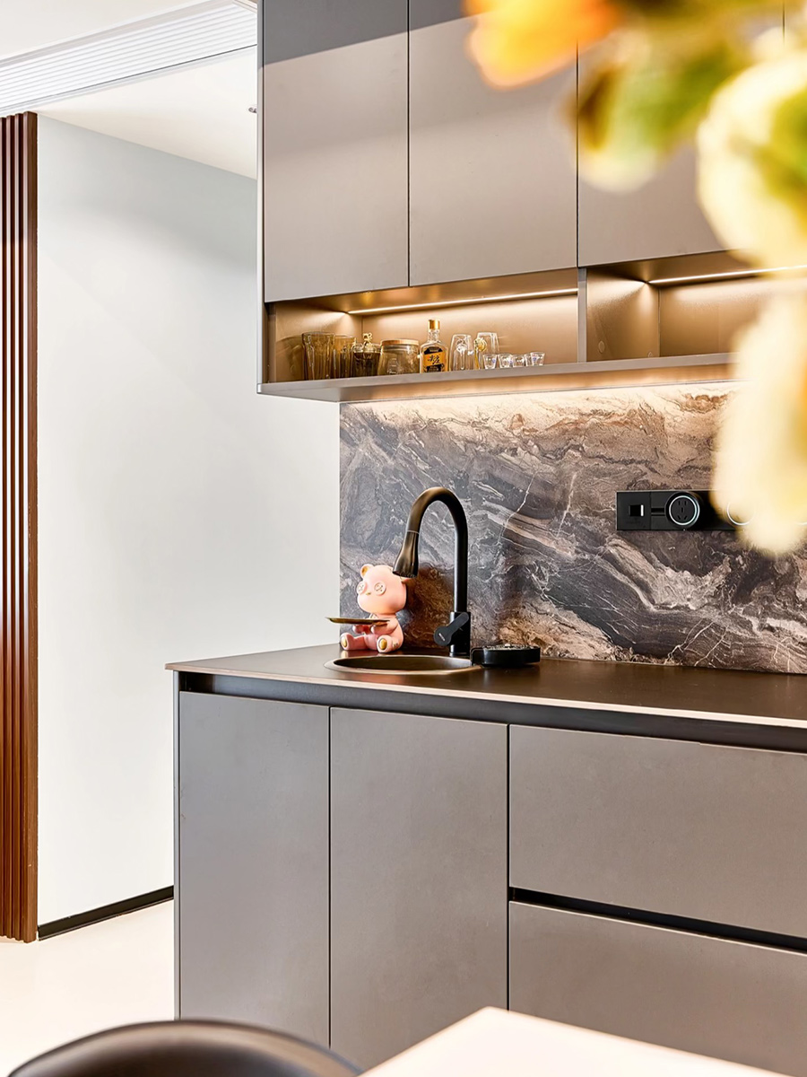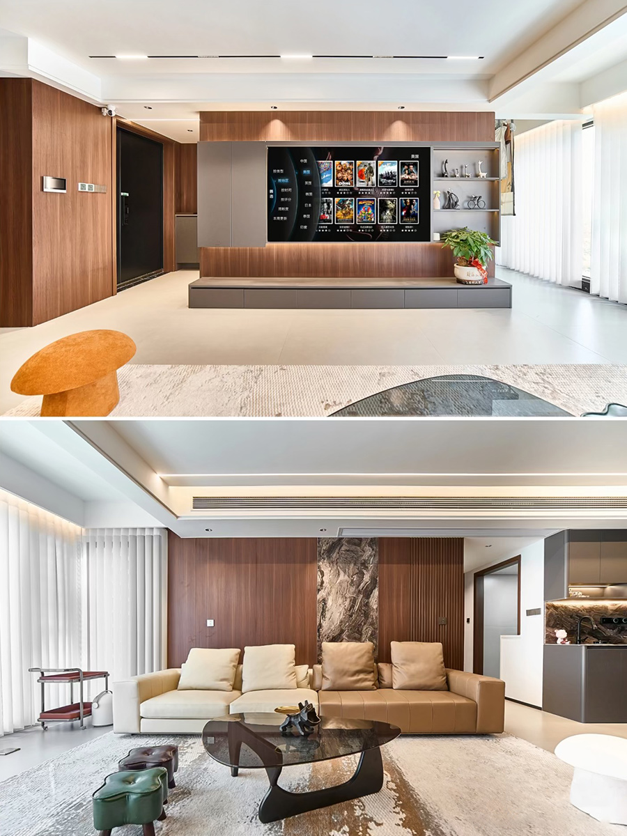 整體采用暖棕意式極簡搭配,搭配巖板、格柵做沙發背景墻。