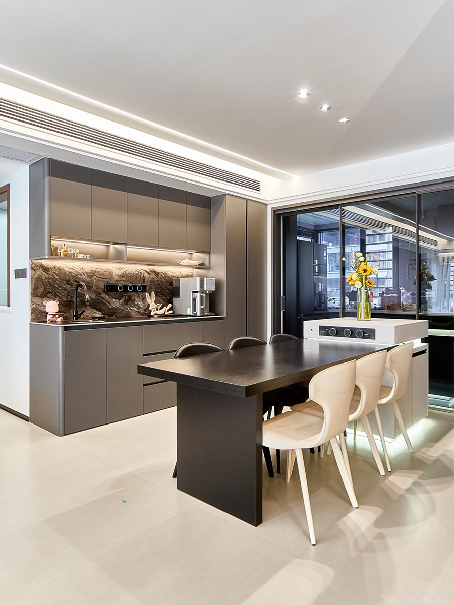 客餐廳無主燈吊頂,搭配線條燈帶增加光源,視覺有延伸感。