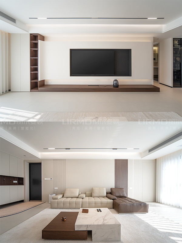 弧形懸空電視墻內嵌燈帶,弧形設計,使電視背景墻左右側平緩過渡,內部安裝氛圍燈,烘托出家的暖意