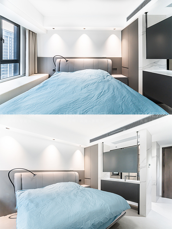 木紋護墻板搭配極簡線條設計,空間以質感與奢雅為基調,簡潔的設計、利落的線條,低調奢華與精致優雅共生