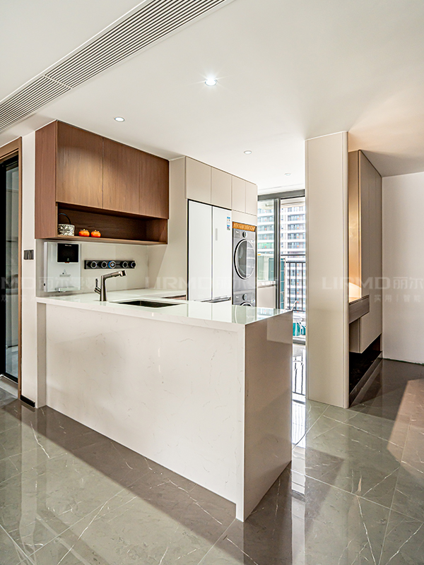 收納柜+巖板背景,巖板+淺木色搭配,層次感拉滿!柜門無拉手設計,按壓反彈器開合,極簡不雜亂