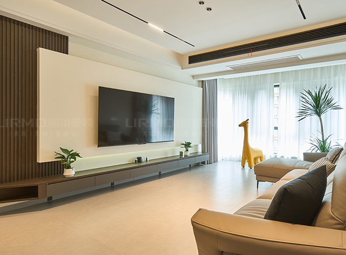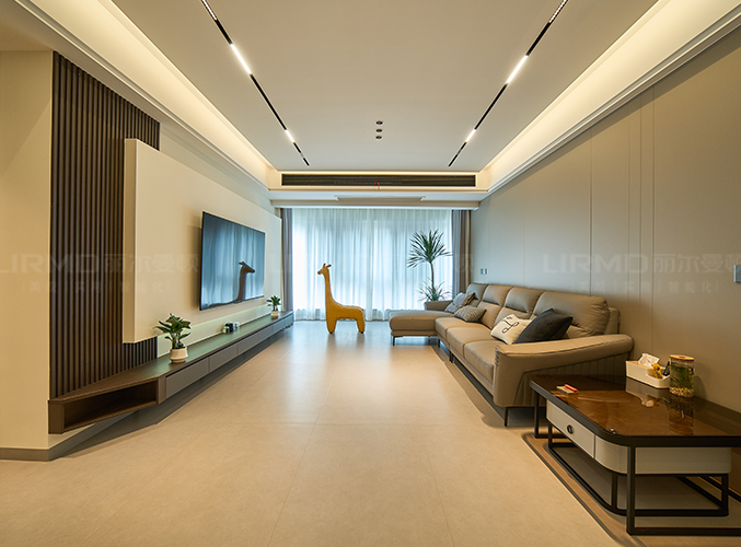 整墻做電視背景懸浮柜,整體灰色系基調搭配無主燈設計,線性燈帶營造滿滿高級感。