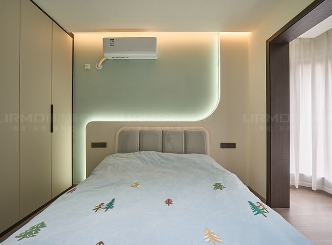主臥延續低飽和度色系+深灰色一柜到頂衣柜,床頭裝木紋板搭配暖色氛圍燈烘托安靜柔和的氛圍,