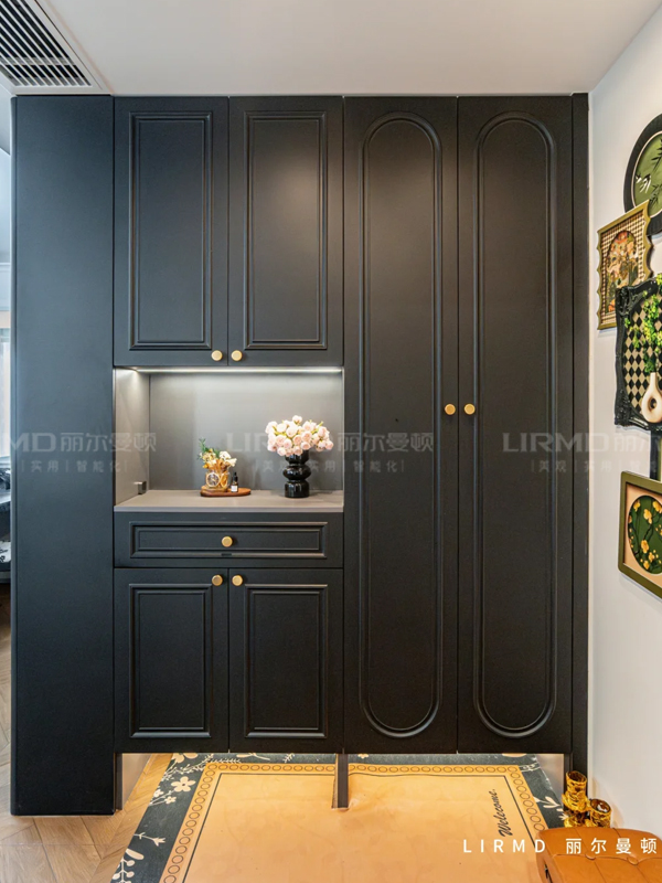入戶玄關:金剛黑柜門搭配金色拉手,大氣不占地!底部懸空放拖鞋,中間鏤空隨手放鑰匙,實用值MAX