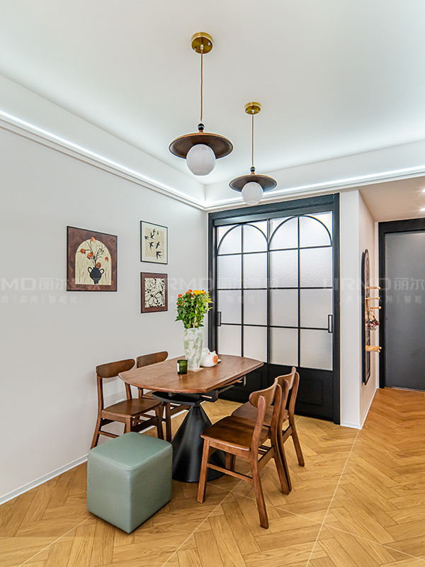 過道設計成弧形門洞,搭配中古吊燈、錯落有致的掛畫,中古的浪漫格調呼之欲出。