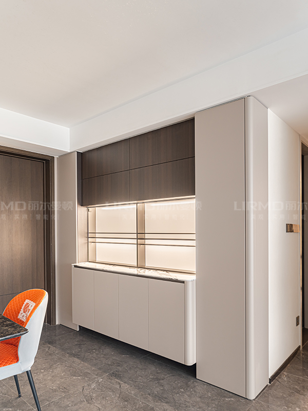 懸浮柜+意式發光薄柜的搭配,立體效果絕了,和整個空間色調完美融合,干飯儀式感都變足了